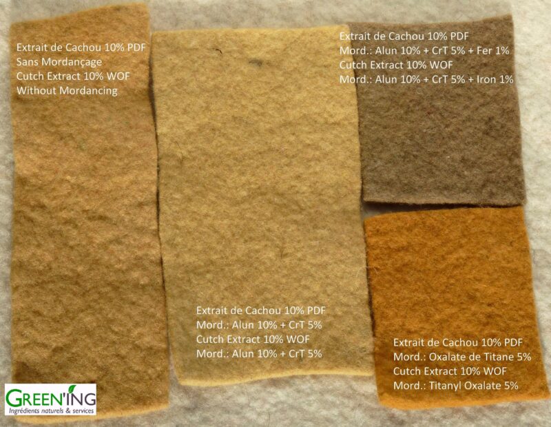 Natural dyeing and textile printing : this plant extract also allows to dye with or without mordant. There is enough tannin in cutch so mordanting with another tannin is not required. The resulting shades cover almost all the range of browns. Cutch has excellent light and washfastness properties.